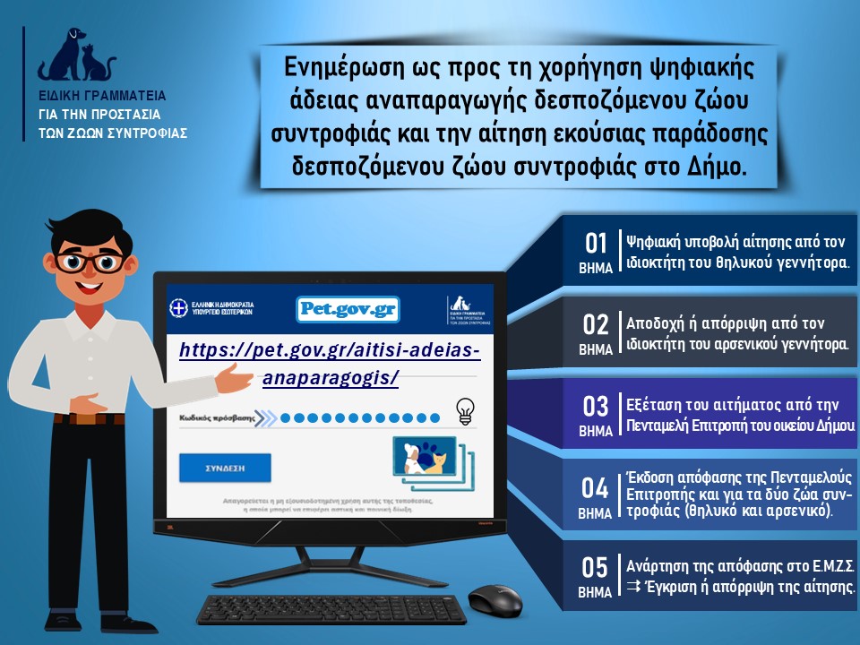 Τι ισχύει για την αναπαραγωγή ενός δεσποζόμενου ζώου; Και τι γίνεται όταν ένας ιδιοκτήτης δεν μπορεί πλέον να το φροντίσει; Η Ειδική Γραμματεία για την Προστασία των Ζώων Συντροφιάς, μετά από ερωτήματα που έχει δεχθεί από Δήμους σε όλη τη χώρα, εξέδωσε διευκρινιστικό έγγραφο για δύο σημαντικές διαδικασίες που πραγματοποιούνται ψηφιακά μέσω του pet.gov.gr. Άδεια …