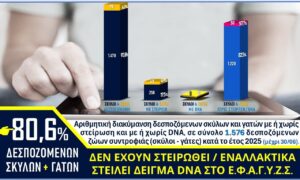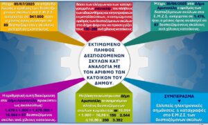 📌 Όπως σε όλους τους Δήμους, εξετάστηκαν τα στοιχεία για τα αδέσποτα και τα δεσποζόμενα ζώα συντροφιάς που είναι καταγεγραμμένα στο ΕΜΖΣ (Εικόνες 2 και 3) και δόθηκαν οδηγίες για την καταγραφή και χαρτογράφηση γατοαποικιών. Το 80,6% των δεσποζόμενων ζώων δεν είναι στειρωμένα ή δεν έχει σταλεί δείγμα DNA, ένα ιδιαίτερα υψηλό ποσοστό , το οποίο σε συνδυασμό με τις ελλιπείς καταγραφές δεσποζόμενων στο ΕΜΖΣ (Εικόνα 4- εκτίμηση δεσποζόμενων σκύλων) – αποδεικνύει τον κίνδυνο δημιουργίας νέων αδέσποτων. Είναι απαραίτητες ενημερωτικές δράσεις προς τους πολίτες, αλλά και αυστηροί έλεγχοι από την ΕΛΑΣ για ηλεκτρονική σήμανση και καταχώριση στο ΕΜΖΣ.