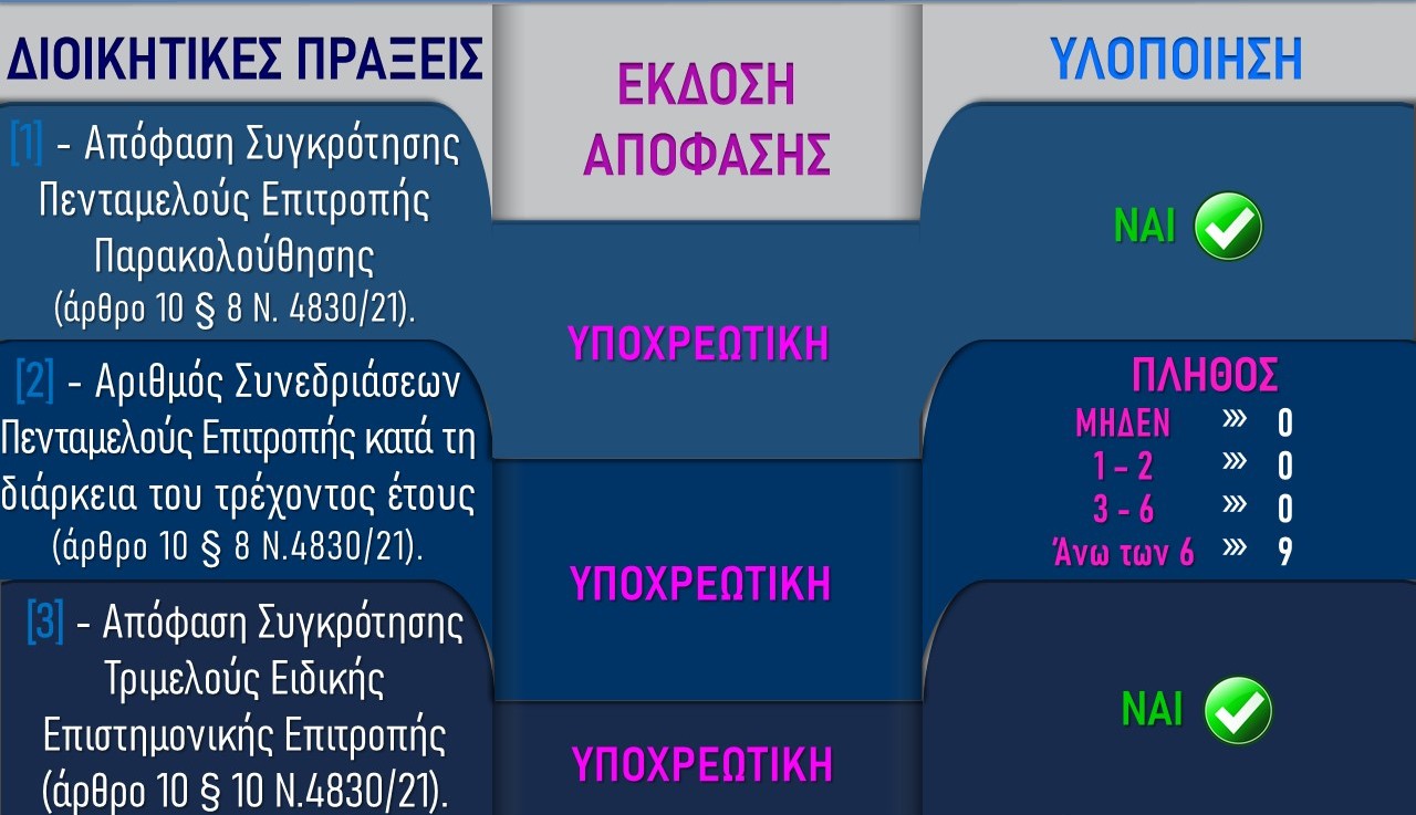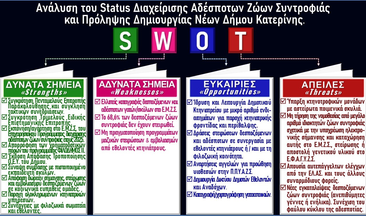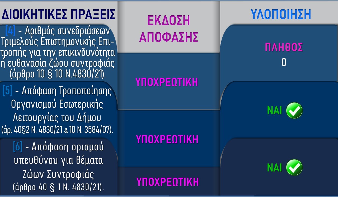 ✅ Ο Δήμος Κατερίνης έχει ήδη προχωρήσει στις περισσότερες από τις υποχρεωτικές διοικητικές πράξεις που προβλέπει ο Ν.4830/21, έχει ορίσει υπεύθυνο για τα ζώα συντροφιάς, έχει συστήσει πενταμελή και τριμελή επιτροπή, με την πενταμελή να συνεδριάζει τακτικά (Εικόνες 1, 2). Παράλληλα, έχει υποβάλει το επιχειρησιακό του πρόγραμμα για το 2025 στο ΕΜΖΣ, παρέχει πλήρεις κτηνιατρικές υπηρεσίες μέσω συνεργαζόμενου κτηνιάτρου και έχει ήδη δρομολογήσει τη δημιουργία δημοτικού κτηνιατρείου.