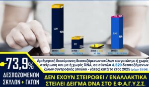 (Εικόνες 2 και 3). Σύμφωνα με τα στοιχεία του ΕΜΖΣ, το 73,9% των ιδιόκτητων ζώων δεν είναι στειρωμένα ή δεν έχει ληφθεί DNA.