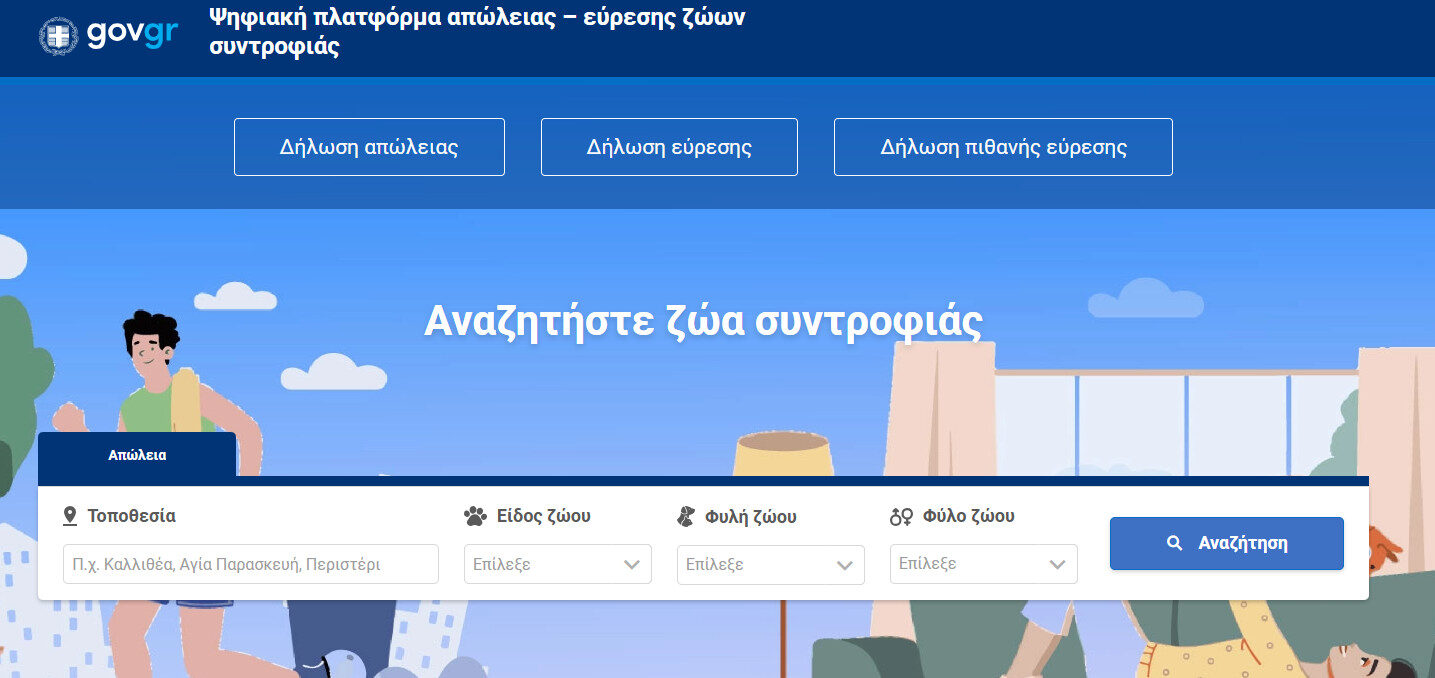 Εάν είστε ιδιοκτήτης ή ανάδοχος ζώου συντροφιάς μπορείτε μέσω της ψηφιακής πλατφόρμας απώλειας-εύρεσης ζώων συντροφιάς να υποβάλετε δήλωση απώλειας ή/και εύρεσης ζώου συντροφιάς.
