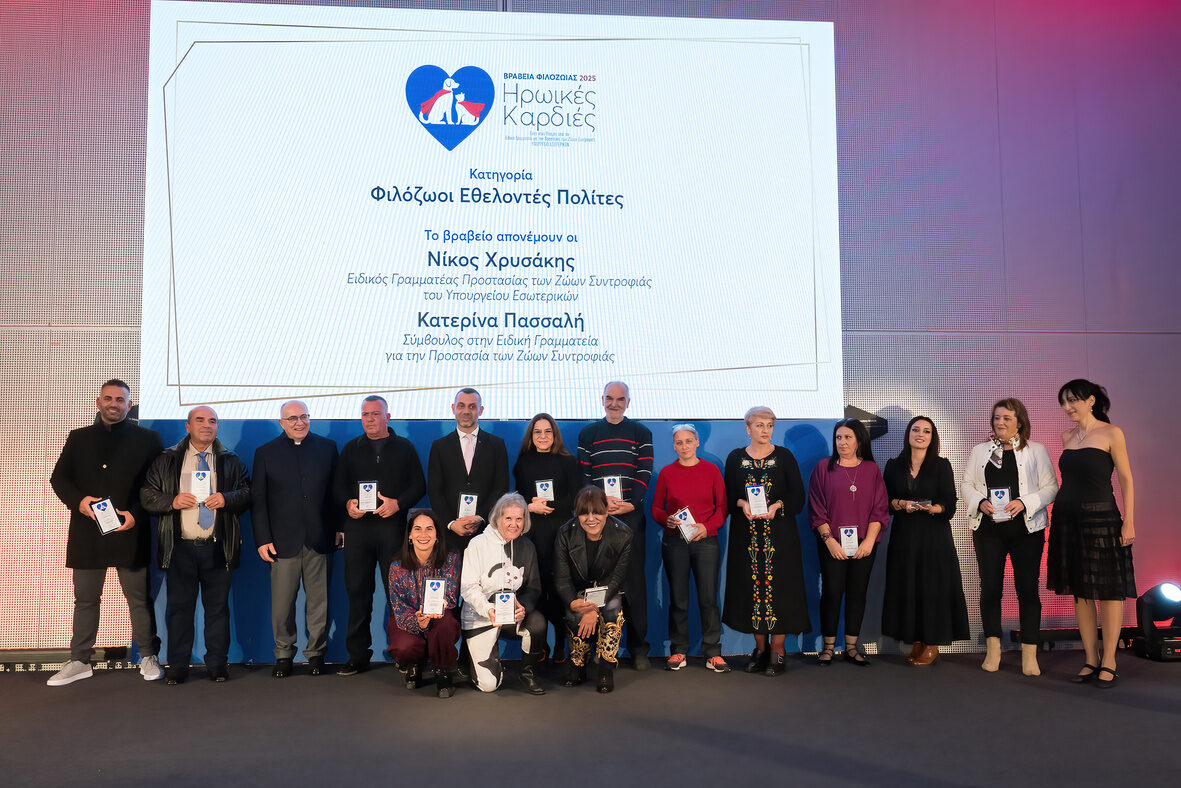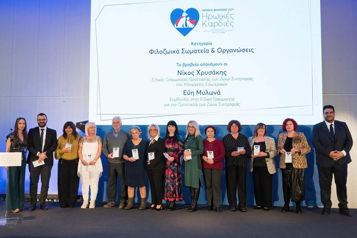 Η Ειδική Γραμματεία Προστασίας των Ζώων Συντροφιάς του Υπουργείου Εσωτερικών ευχαριστεί θερμά όλους όσοι τίμησαν με την παρουσία τους τα «Βραβεία Φιλοζωίας 2025 – Ηρωικές Καρδιές», καθώς και τους 168 βραβευθέντες που με το έργο τους αποτελούν ζωντανό κύτταρο προσφοράς και ανθρωπιάς σε όλη τη χώρα. Η εκδήλωση πραγματοποιήθηκε την Παρασκευή 5 Δεκεμβρίου 2025, στο Συνεδριακό Κέντρο της Εθνικής Ασφαλιστικής, σε μια κατάμεστη αίθουσα 430 καλεσμένων που ταξίδεψαν από κάθε γωνιά της Ελλάδας για να στηρίξουν και να τιμήσουν μία κοινή υπόσχεση: ότι η προστασία των ζώων μας ενώνει πέρα από αποστάσεις, γεωγραφίες και ρόλους. Ήταν η πρώτη μεγάλη θεσμική βραδιά αφιερωμένη σε όλους όσοι αποτελούν τη ραχοκοκαλιά ενός πανελλαδικού δικτύου ευθύνης, συνέπειας και συνεργασίας.